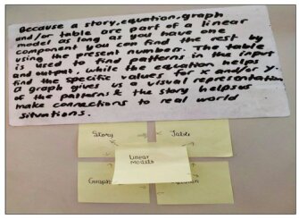 Similarly, math teacher Courtney Paull asked her students to connect five concepts using Mail-it notes: linear models, table, story, graph, and equation. Then, they wrote a paragraph nearly how the concepts are related.